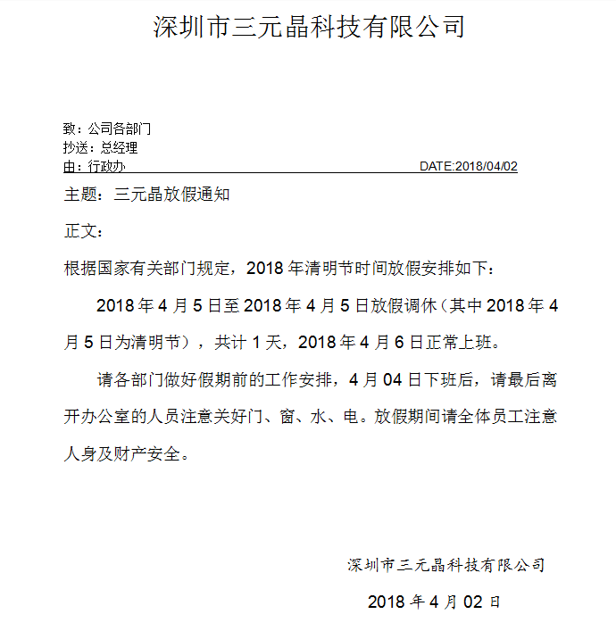根據(jù)國(guó)務(wù)院辦公廳通知精神與本公司的實(shí)際情況結(jié)合,三元晶科技有限公司2018年“清明”放假安排: 2018年4月5日(周四)至2018年4月5日(周四)放假1天;于2018年4月6日(周五)正式上班。